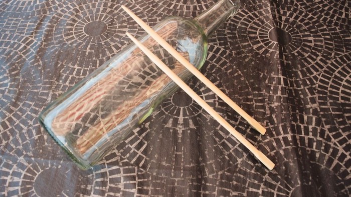 Рекомендуем именно этот способ очистки, ведь он наиболее быстрый и при этом «чистый». Вам понадобится инвентарь: бутылка с узким горлышком (от колы или, например, вина) и китайские палочки или пара пластиковых трубочек. А далее всё просто.