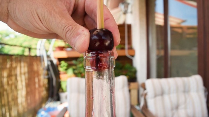 Ягоду ставите на горлышко и ровно посередине насквозь пробиваете палочкой. Косточка падает прямиком в бутылку, а в руках у вас остаётся чистая и мягкая ягода. Видео ниже доказывает, как это легко и просто.