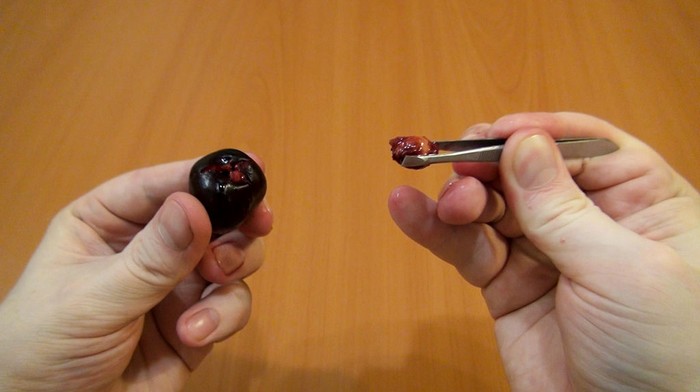 Извлеките косточку пинцетом. Да, именно так просто. Преимущество способа в том, что ягода после такой операции останется целой.