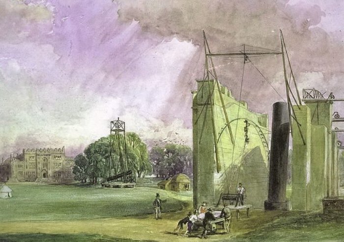 Обсерватория лорда Росса в замке Бирр (Ирландия). Здесь находился его 72-дюймовый (183-сантиметровый) телескоп под названием «Левиафан». Гравюра на медной пластине 1860 года.