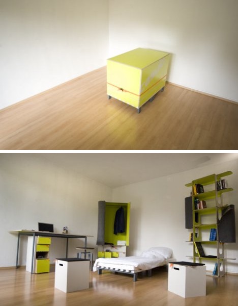 Немецкие «интерьерщики» Себастиан Мелхаузер (Sebastian Mühlhäuser) и Марсель Крингс (Marcel Krings) нашли принципиально новое решение для экономии квадратных метров. Разобранные и сложенные вместе предметы мебели из набора Casulo выглядят как обычная коробка 80*120 см. Однако внутри нее умещается целая комната. При этом полезная площадь стола в «развернутом» виде – 80*160 см, кровати – 200*80 см. Сборка не требует наличия каких-либо инструментов и занимает около десяти минут. Комплект мебели из ящика Casulo – идеальное решение для владельцев небольших помещений и тех, кто не любит подолгу жить на одном месте. Кстати, Себастиан и Марсель – не единственные, кто додумался до изобретения компактной и мобильной мебели.