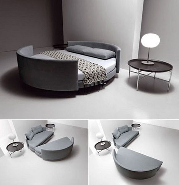 Круглая кровать Circular sofa bed от итальянского бренда Saba придется по вкусу не желающим жить в тесноте хозяевам студий и однокомнатных квартир, в которых спальня совмещена с гостиной. После подъема Circular sofa bed можно «разбить» на два дивана.